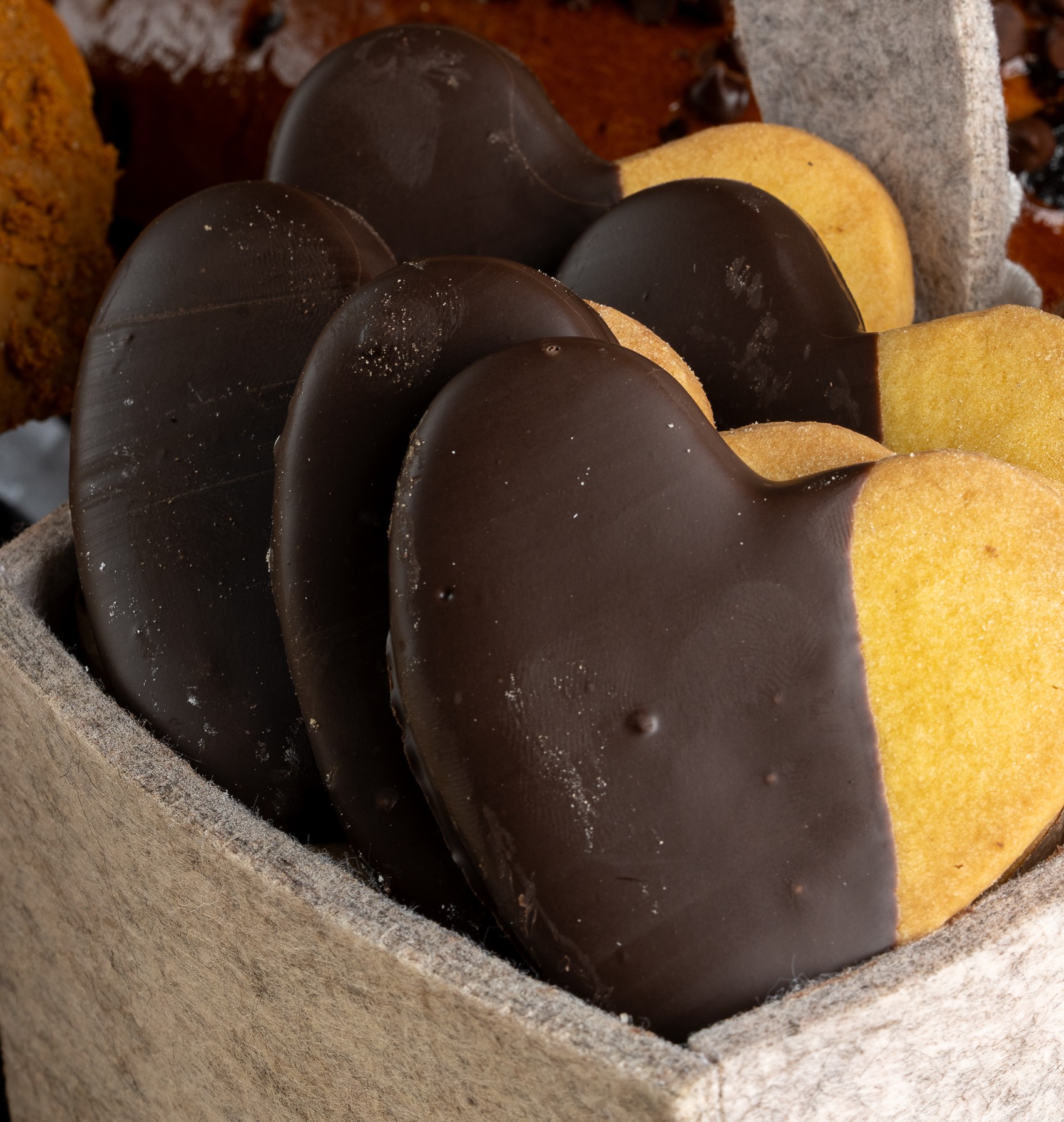 Ingredientes: Farinha de TRIGO, margarina [gorduras e óleos vegetais (óleo de palma* e derivados, óleo de girassol e óleo de SOJA em proporções variáveis), água, sal, emulsionante (lecitina de SOJA), aromas, corante orgânico natural (betacaroteno), anti-oxidante: extrato natural rico em tocoferóis e regulador de acidez (ácido cítrico), amido de milho e açúcar. Cobertura: chocolate (açúcar, gordura vegetal hidrogenada: palma* e palmiste, cacau em pó, lecitina de girassol e aroma).