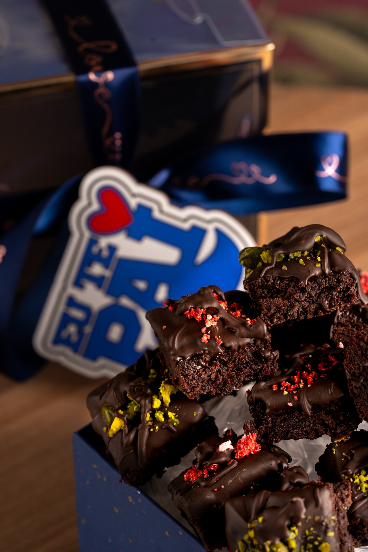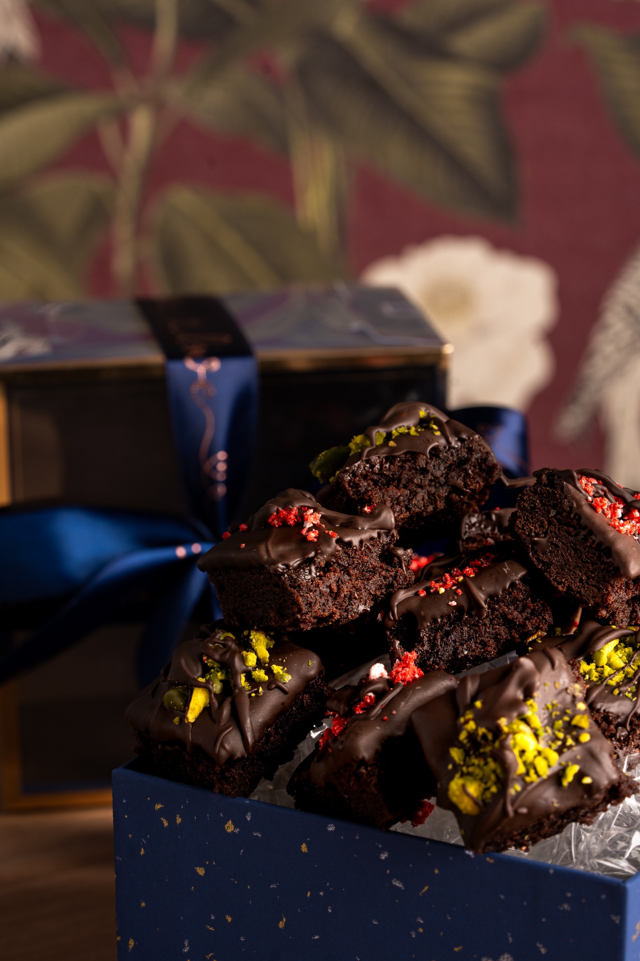 Caixa com Mini Brownie coberto com chocolate crocante. Combinação de cobertura com pistácio e frutos vermehos desidratados