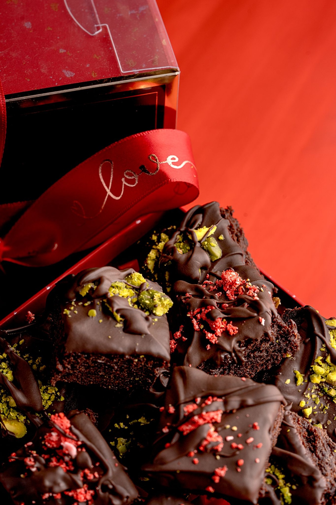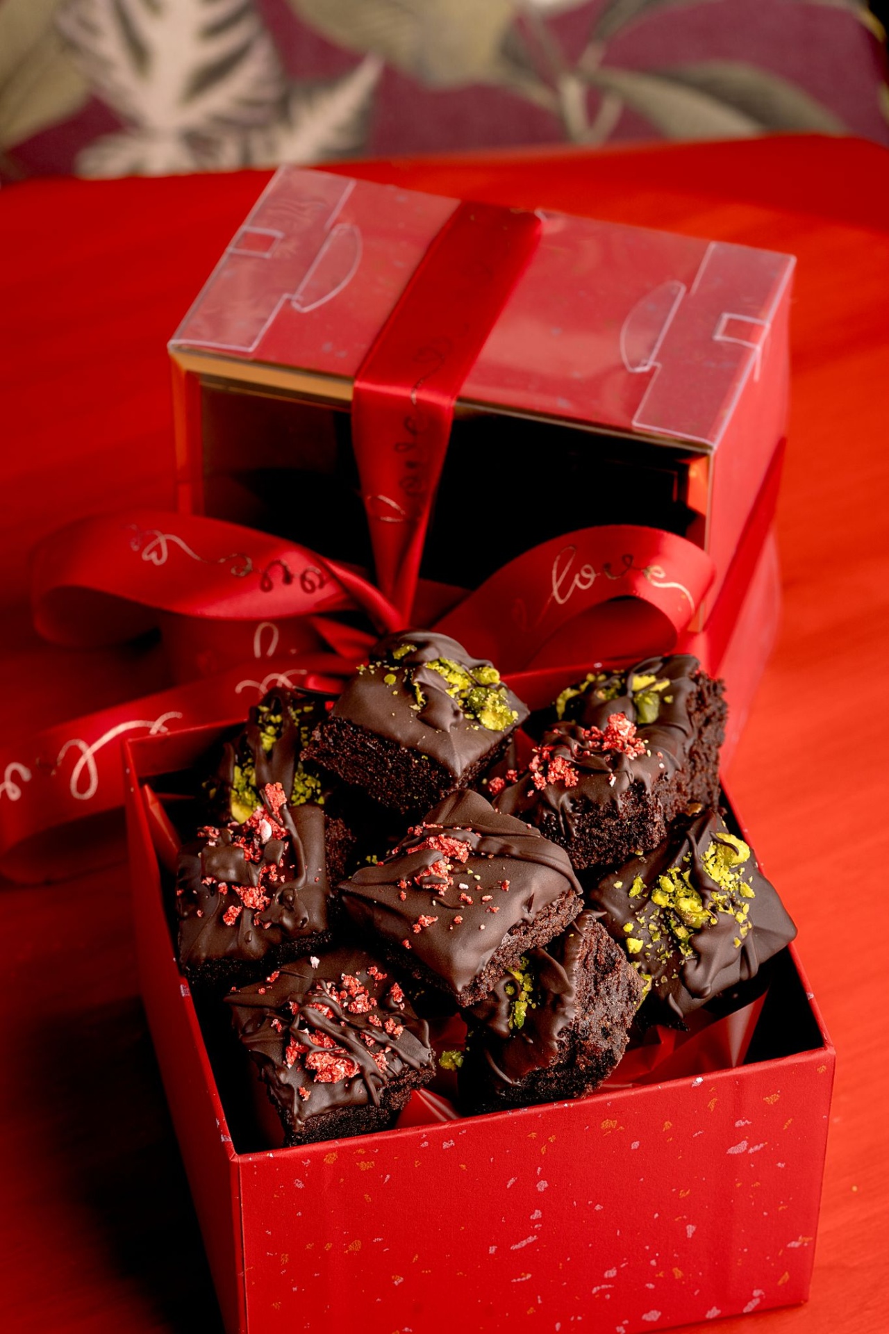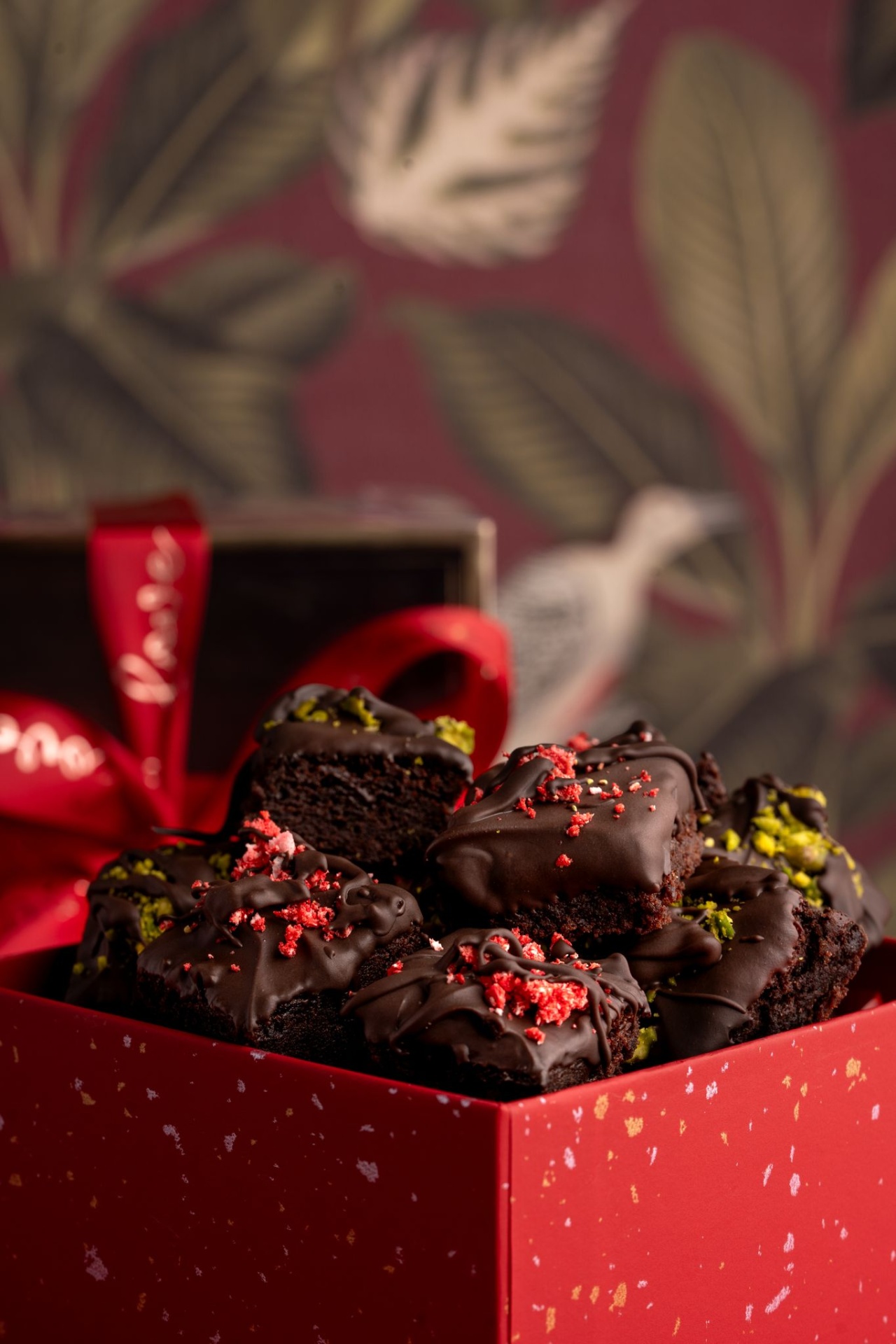 Caixa com Mini Brownie coberto com chocolate crocante. Combinação de cobertura com pistácio e frutos vermehos desidratados