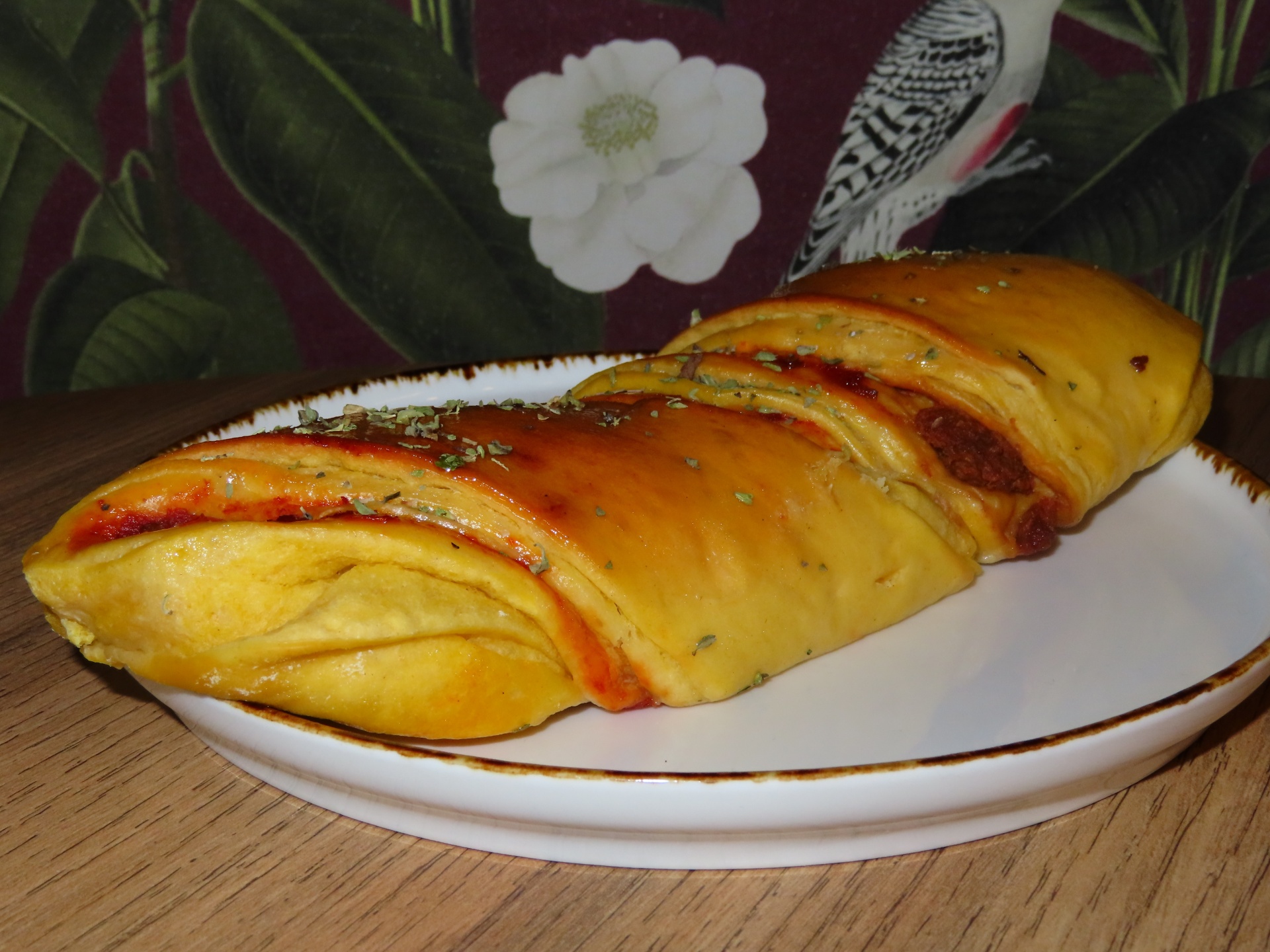 Massa brioche, recheada com molho pizza e toque de "chouriço".